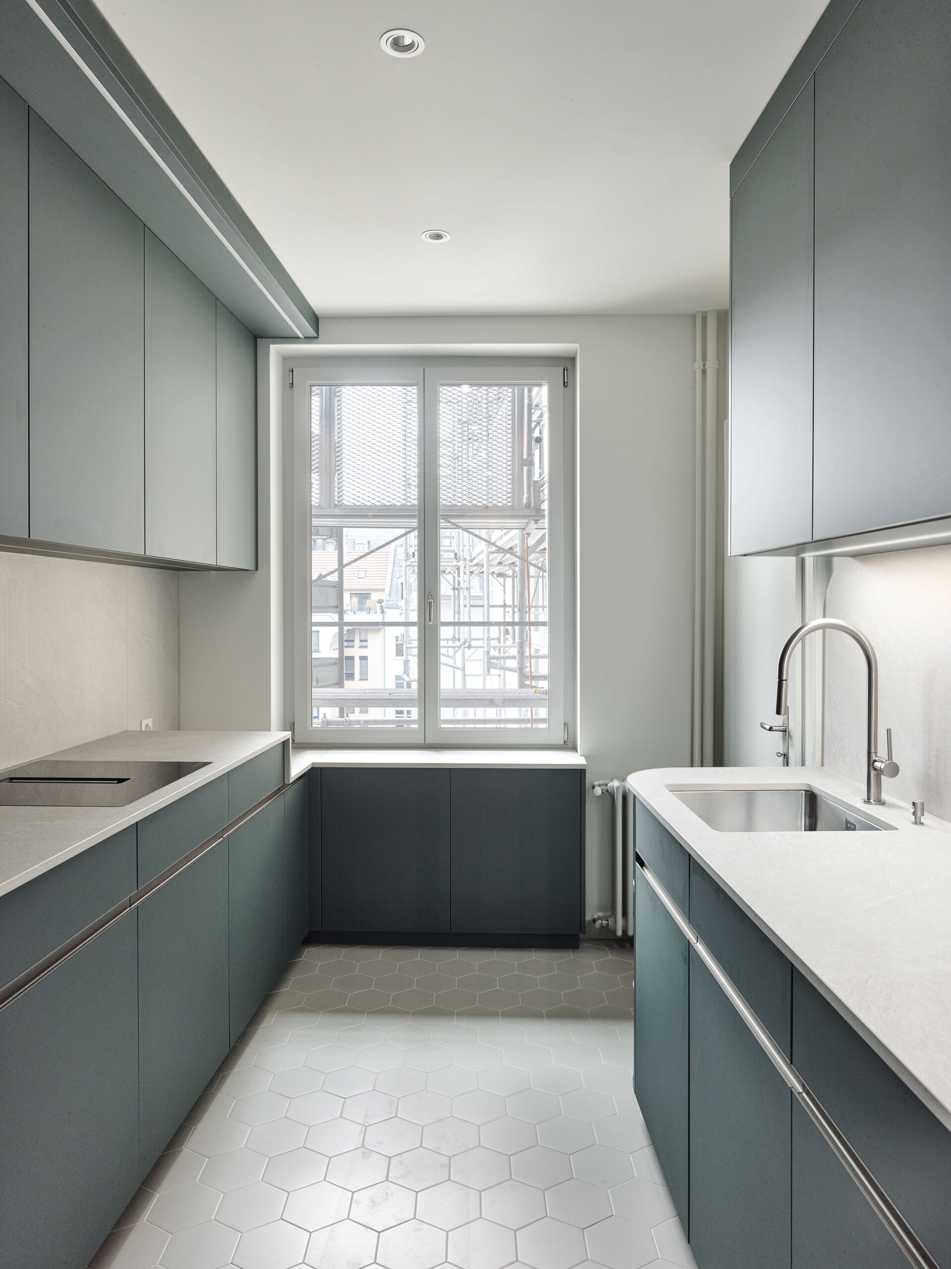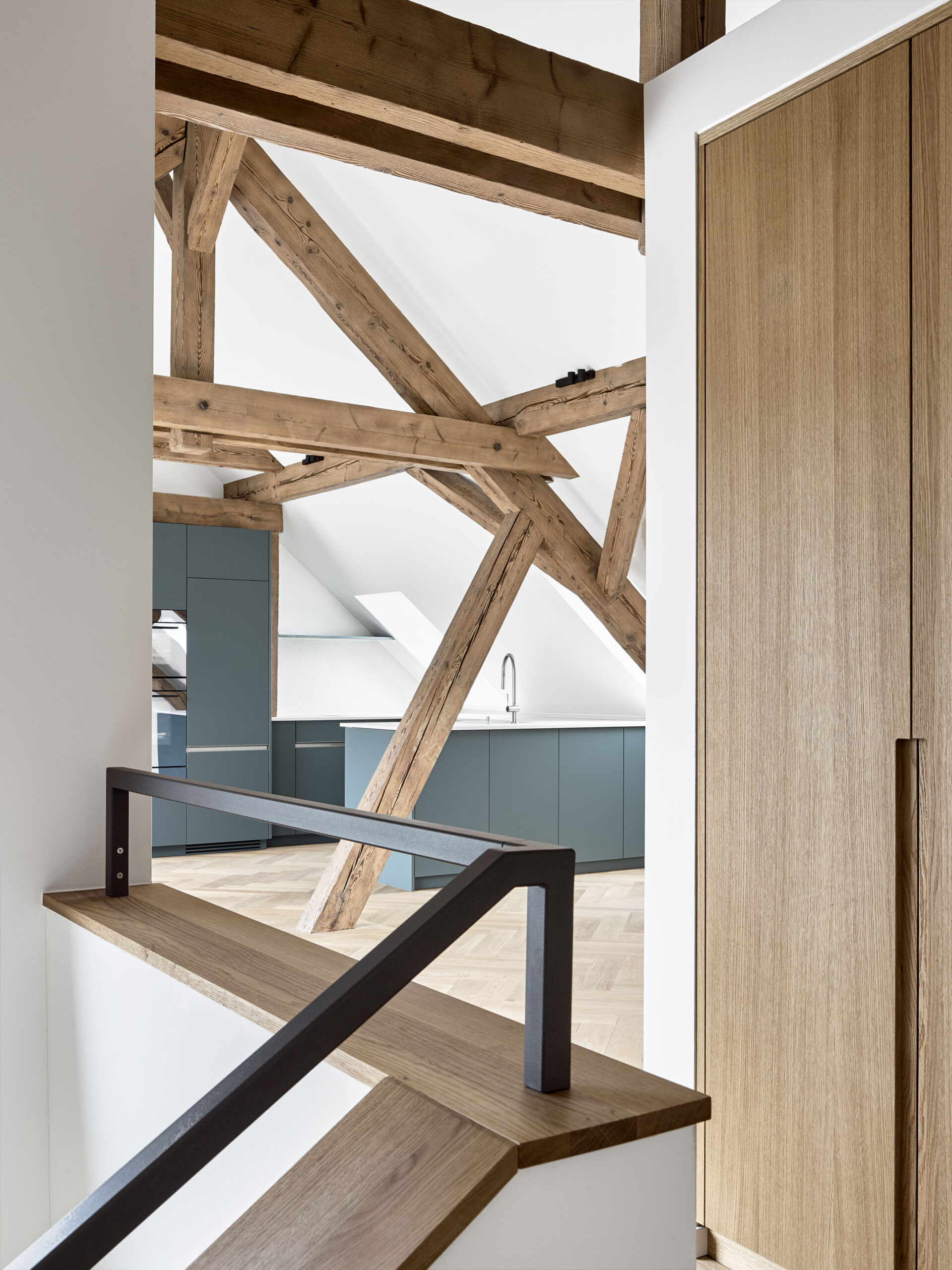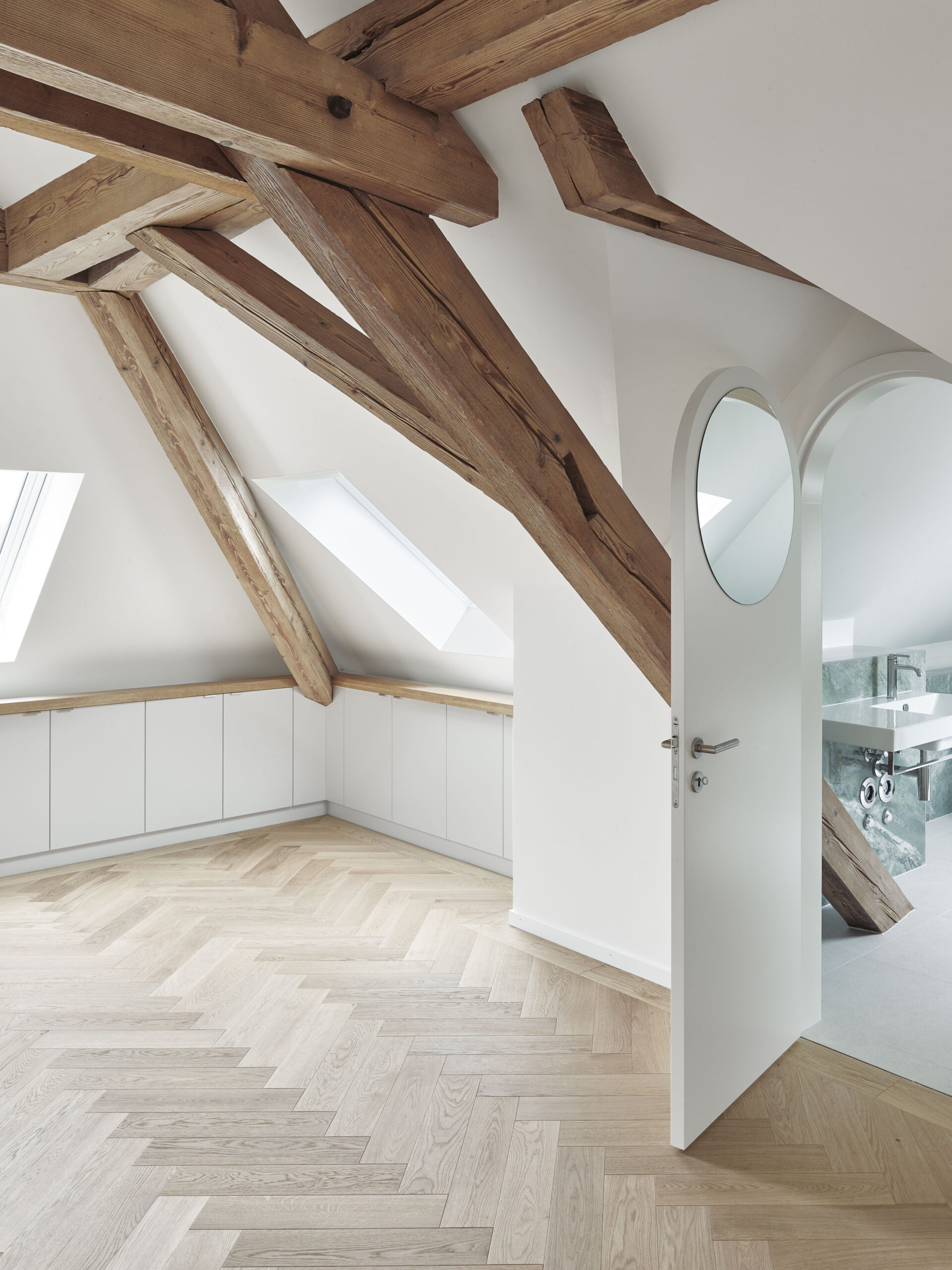 Die zentrale Lage, direkt hinter dem Opernhaus in Zürich, motivierte die Verdichtung dieser Gebäudezeile durch einen Dachausbau. Das oberste Geschoss, welches zur Hälfte in kleine Bedienstetenzimmer eingeteilt war, wurde zu zwei grosszügigen Wohnungen von 5.5 und 4.5 Zimmern umgebaut. Darüber entstand im Dachgeschoss, welches bisher lediglich den Estrich beinhaltete, eine Dachwohnung mit offenem Grundriss. Die sichtbar belassenen Holzbalken erinnern an die Dachkonstruktion, welche ebenfalls energetisch saniert wurden. Die helle Wohnung bietet, über die angegliederte Dachterrasse, einen Ausblick über die Dächer des Seefelds auf den Zürichsee. Die in den Regelgeschossen liegende gemischte Büro- und Wohnnutzung bleibt bestehen.