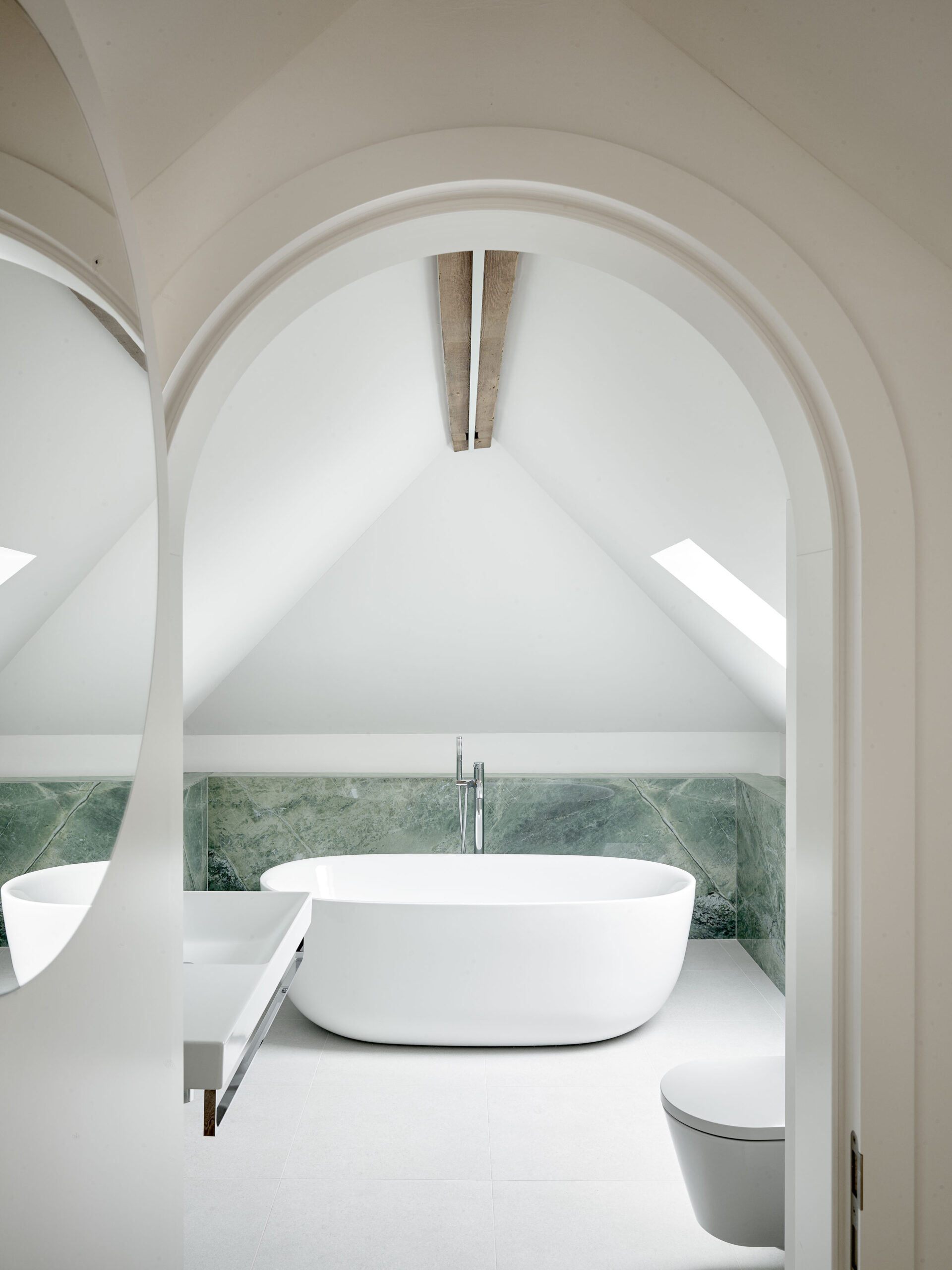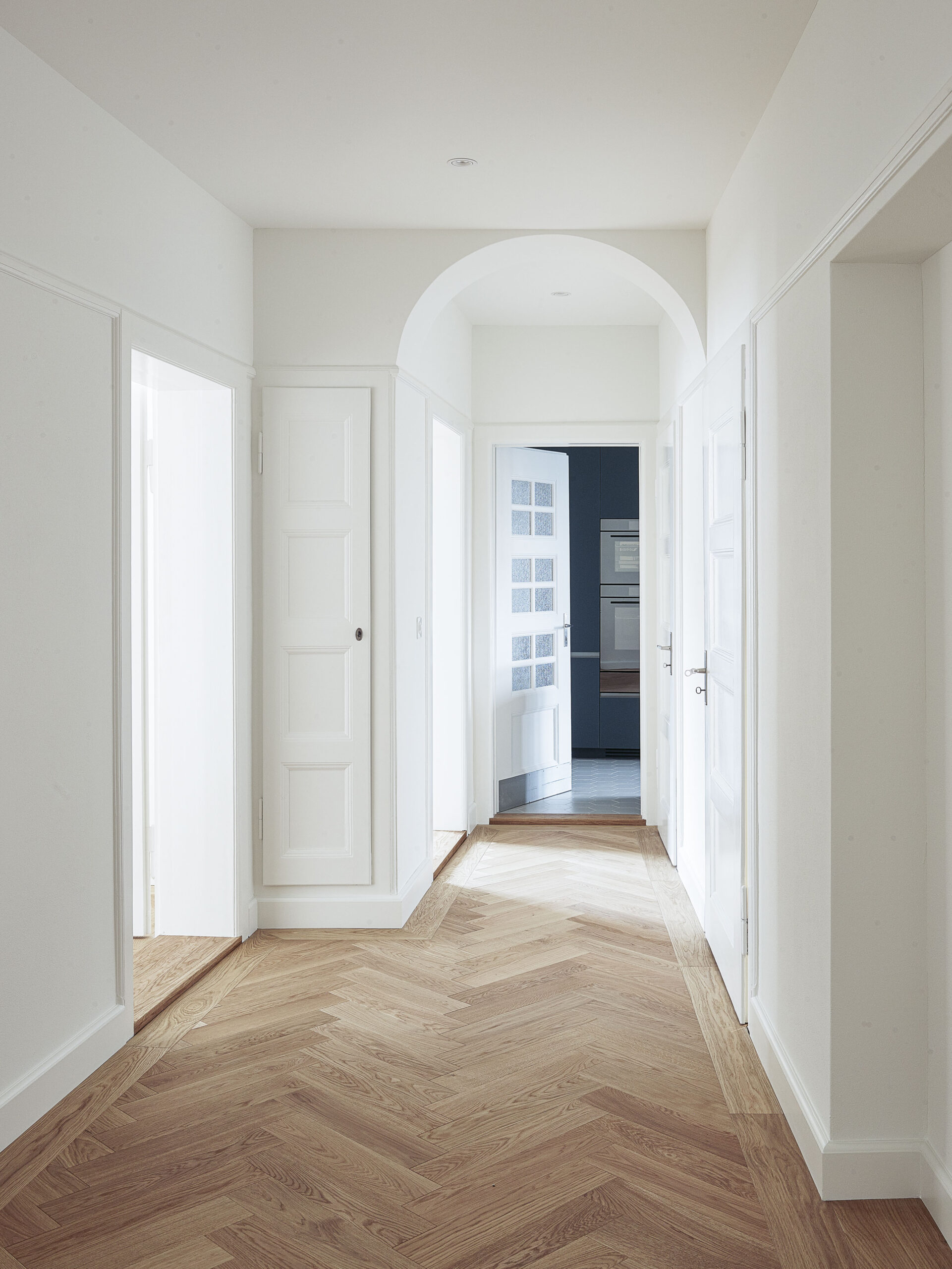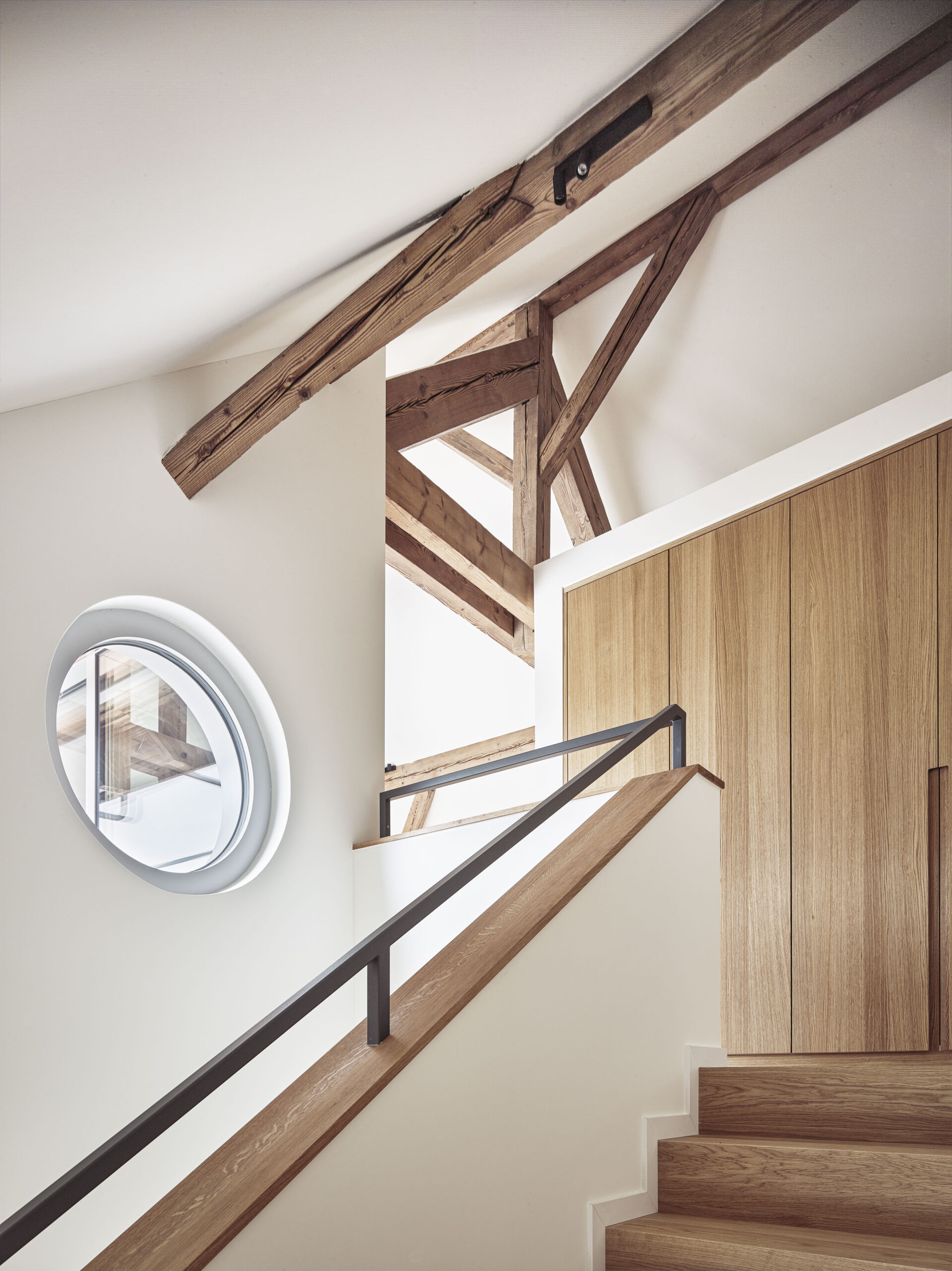 Die zentrale Lage, direkt hinter dem Opernhaus in Zürich, motivierte die Verdichtung dieser Gebäudezeile durch einen Dachausbau. Das oberste Geschoss, welches zur Hälfte in kleine Bedienstetenzimmer eingeteilt war, wurde zu zwei grosszügigen Wohnungen von 5.5 und 4.5 Zimmern umgebaut. Darüber entstand im Dachgeschoss, welches bisher lediglich den Estrich beinhaltete, eine Dachwohnung mit offenem Grundriss. Die sichtbar belassenen Holzbalken erinnern an die Dachkonstruktion, welche ebenfalls energetisch saniert wurden. Die helle Wohnung bietet, über die angegliederte Dachterrasse, einen Ausblick über die Dächer des Seefelds auf den Zürichsee. Die in den Regelgeschossen liegende gemischte Büro- und Wohnnutzung bleibt bestehen.